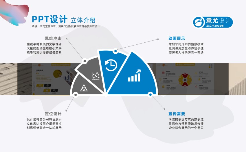 蘇州意尤文化傳播有限公司是一家有著多年廣告設計經驗的蘇州知名廣告企業 主要業務有蘇州PPT設計、蘇州產品PPT設計、蘇州企業PPT設計、蘇州會議PPT設計、蘇州項目PPT設計、企業VI設計、設計印刷宣傳冊/樣本/單頁/名片等 自2007年成立以來,蘇州意尤廣告公司與蘇州及蘇州各市的幾百家中外企業進行了廣告設計合作,經過多年發展公司已形成了以企業PPT設計、企業VI設計,廣告設計,廣告印刷,樣本設計,宣傳冊設計,名片印刷,菜譜制作,單頁,宣傳單等一批特長業務,相信在各位新老客戶的關心下,本公司會得到更大的發展,同時為客戶的發展宣傳保駕護航。